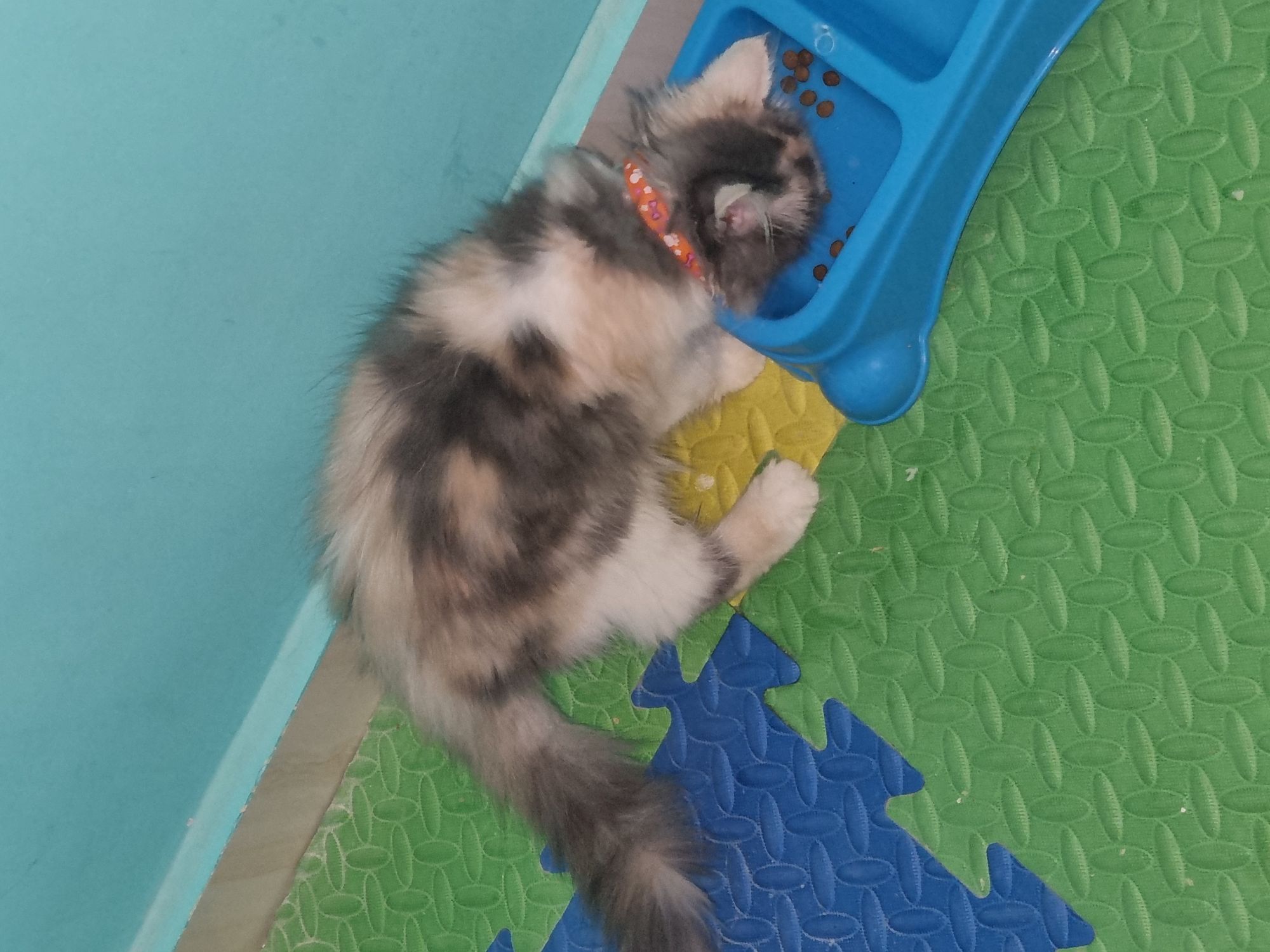 قطة منفوشة جدًا (Fluffy) بفرو كثيف وناعم جسمها متوسط إلى ممتلئ، مديها شكل “دبدوب صغير” 🧸 ذيلها طويل وكثيف بشكل جميل لونها ثلاثي هادئ (كاليكو فاتح) خليط من: أبيض ناصع (مسيطر) رمادي هادي لمسات كريمي/برتقالي فاتح 👉 مديها شكل راقي ومميز جدًا حنينة وبتحب الدلع ❤️ متعودة على الحمل واللعب مع الأطفال هادية مش عدوانية متطعمة كل التطعيمات